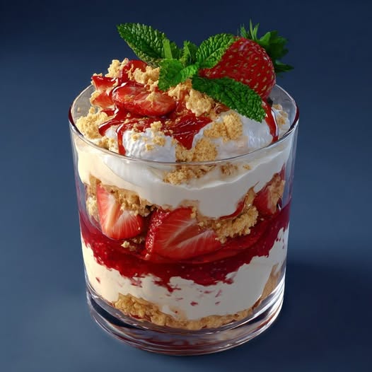 Frische Erdbeeren – 200 g (klein geschnitten, optisch großzügig) Vanille-Mürbeteigkekse – 80 g (zerbröselter, knuspriger Teig) Erdbeersauce – 60 ml (glänzende, bunte Schicht) Minzblätter – 4 kleine (zur Dekoration obenauf) Schlagsahne – 30 ml (zum Auflockern des Mascarpones) Zitronenschale – 1/2 Zitrone (dezent zum Mascarpone hinzugefügt)