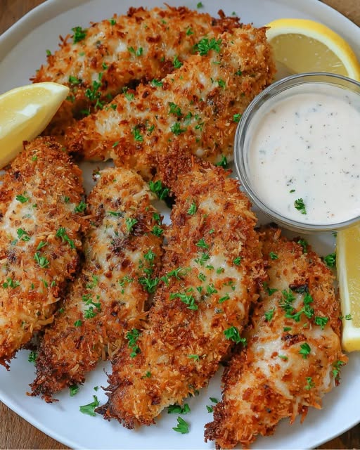 Saftige Hähnchen-Tenders, umhüllt mit einer knusprigen Panade aus Panko, Parmesan und würzigem Ranch-Gewürz, werden hier schonend im Air Fryer zubereitet. Die Kombination aus Paprika und Parmesan sorgt für ein herzhaftes Aroma, während die schnelle Zubereitung die Tenders innerhalb von 20 Minuten auf den Tisch bringt. Erst werden die Hähnchenstreifen im Mehl gewendet, anschließend in verquirltes Ei getaucht und danach in der Panko-Parmesan-Mischung paniert. Im Air Fryer werden sie goldbraun und bleiben innen wunderbar zart. Perfekt mit Dip und Beilage servierbar.