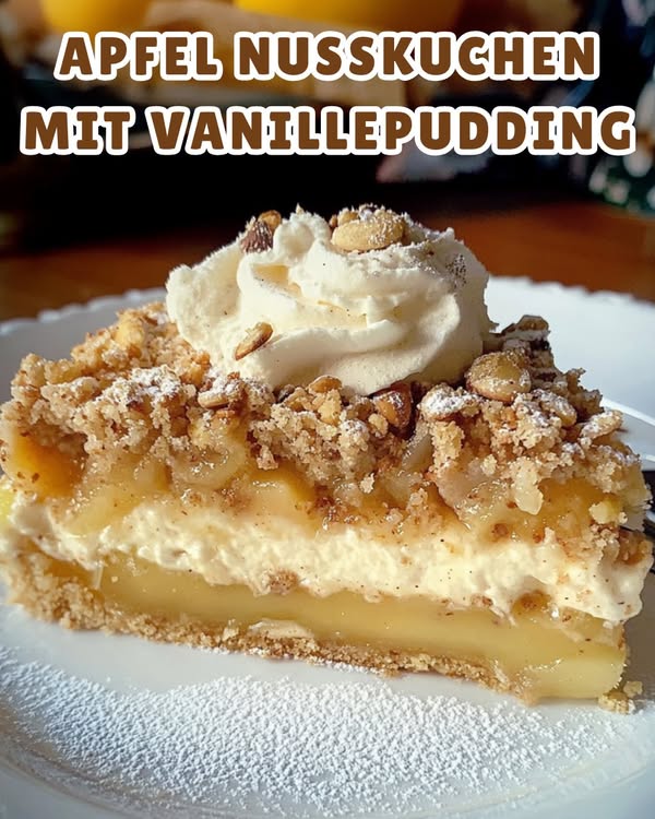 Ein saftiger Apfelkuchen auf Nussbiskuit mit einer cremigen Schicht Vanillepudding und knusprigen Haselnussstreuseln – perfekt für den Herbst.