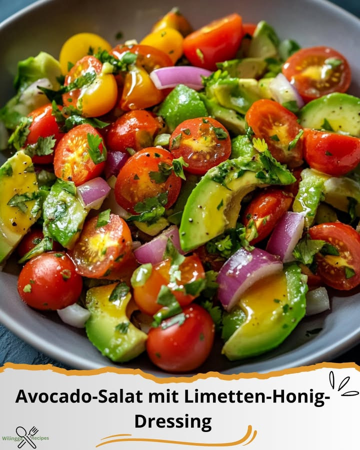 Zutaten:– 2 reife Avocados– 250 g Kirschtomaten– 1 rote Zwiebel– 1 Bund frischer Koriander– Saft von 2 Limetten– 2 Esslöffel Honig– 3 Esslöffel Olivenöl– Salz nach Geschmack– Pfeffer nach GeschmackZubereitung: siehe Fortsetzung auf der nächsten Seite