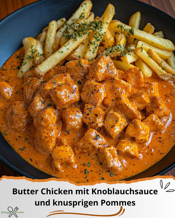 Zutaten:– 500 g Hähnchenbrustfilet, gewürfelt– 100 g Butter– 4 Zehen Knoblauch, fein gehackt– 200 ml Sahne– 1 Teelöffel Garam Masala– Salz nach Geschmack– Pommes FritesAnleitung: siehe Fortsetzung auf der nächsten Seite