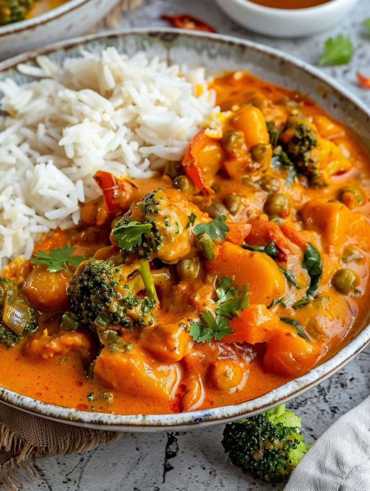 Zutaten:– 400 g Süßkartoffeln, gewürfelt– 300 g Brokkoli, gehackt– 150 g Zwiebel, gehackt– 2 Knoblauchzehen, gehackt– 15 g Ingwer, gerieben– 400 ml Kokosmilch (1 Dose)– 30 g Currypulver (2 Esslöffel)– Salz nach Geschmack– Olivenöl zum Braten– Frischer Koriander, zum GarnierenZubereitung: