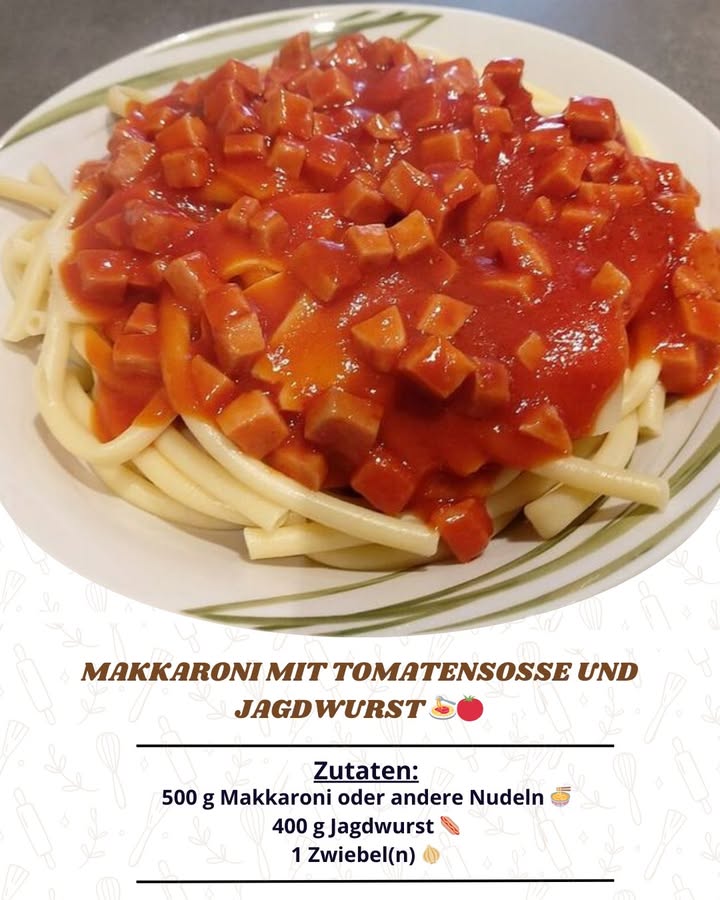 Zutaten:– 500 g Makkaroni oder andere Nudeln– 400 g Jagdwurst– 1 Zwiebel– Margarine– etwas Mehl– 1 1/2 Liter Gemüsebrühe– 1/2 Flasche Ketchup– 1/2 Tube Tomatenmark– 1 TL, gehäuft Zucker– 1 Spritzer Zitronensaft– Salz und PfefferAnleitung: