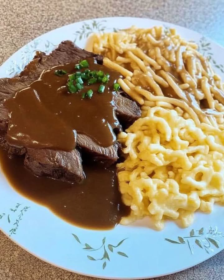 Zutaten:– 900-1350 g Rinderbraten– 480 ml Buttermilch– 1 Zwiebel, gehackt– 2 Karotten, gehackt– 2 Stangen Sellerie, gehackt– 3 Knoblauchzehen, gehackt– 240 ml Essig (Rotwein- oder Apfelwein)– 100 g Zucker– 60 g Salz– 5 g Pfeffer– 5 g Senfkörner– 5 g Piment– Spätzle (zum Servieren)– Frische Petersilie (zum Garnieren)Zubereitung: