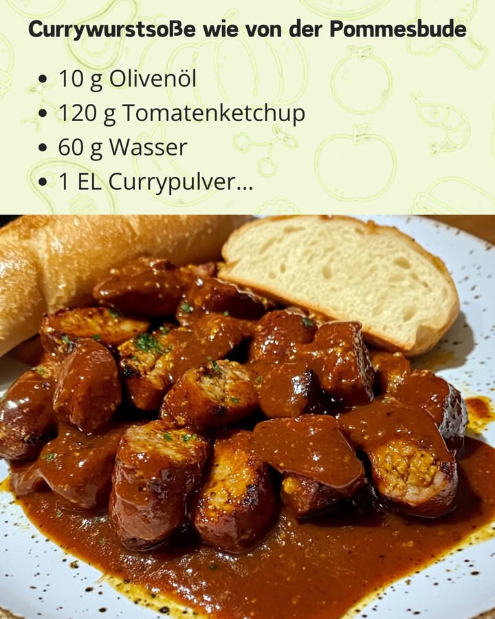 Zutaten:– 10 g Olivenöl– 120 g Tomatenketchup– 60 g Wasser– 1 EL Currypulver– 1/2 TL Cayennepfeffer– 1/2 TL Brühe, gekörnte– 2 EL Zucker– 1/2 TL Salz– 1 Prise Pfeffer– evtl. EssigZubereitung:
