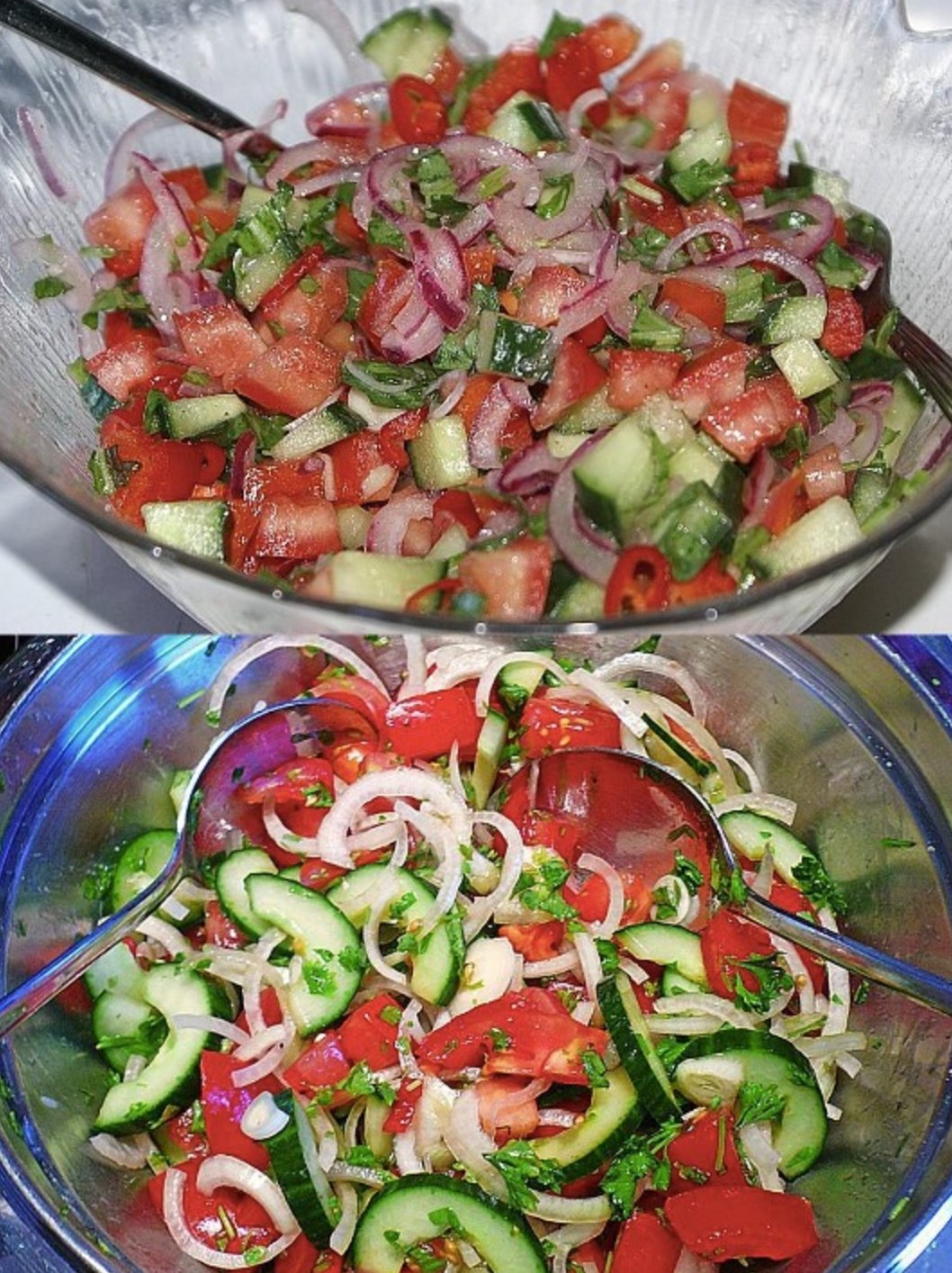 Freunde wenn Sie meine Beiträge in Ihrem Feed sehen, hinterlassen Sie bitte ein Kommentar Zutaten 250 g Gurken 1 kleine Peperoni 150 g Zwiebeln 1 TL Salz 450 g Tomaten Petersilie Für das Dressing: Pfeffer und Salz 30 ml Öl 30 ml Zitronensaft, frisch gepresster Zubereitung