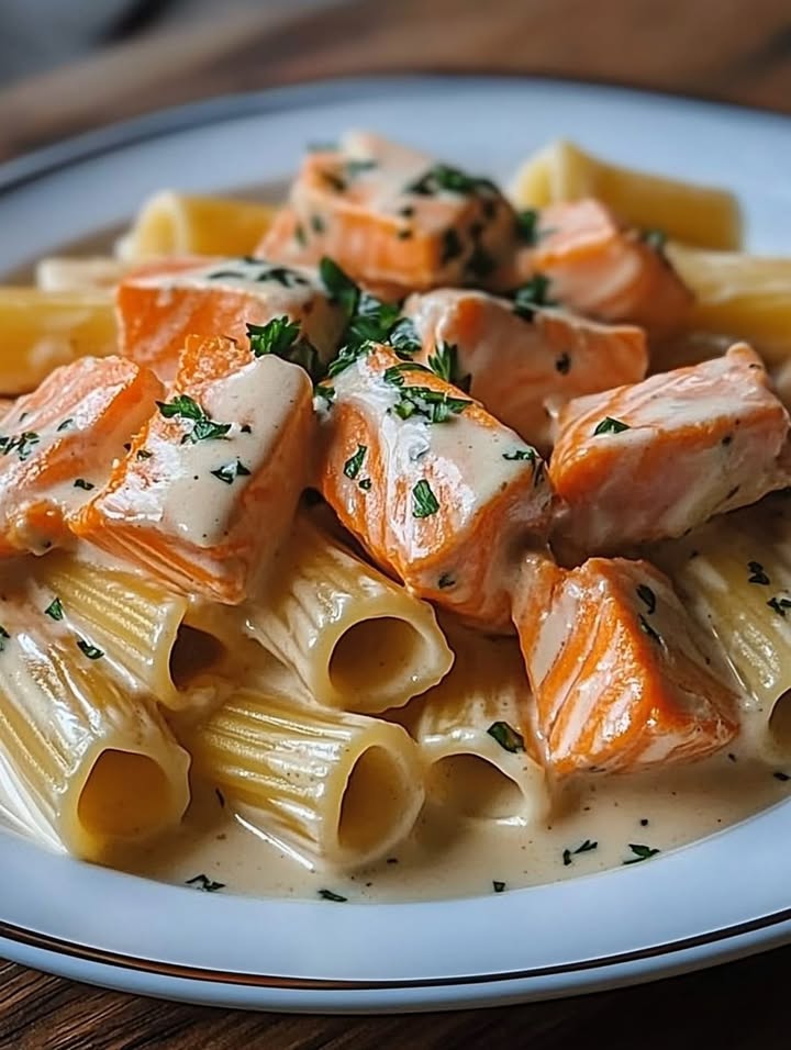 Zutaten:– 250 g Lachsfilet– 250 g Nudeln– 1 Zitrone– 2 Knoblauchzehen– 1 Zwiebel– 200 ml Sahne– Salz– Pfeffer– frische Petersilie– OlivenölZubereitung:
