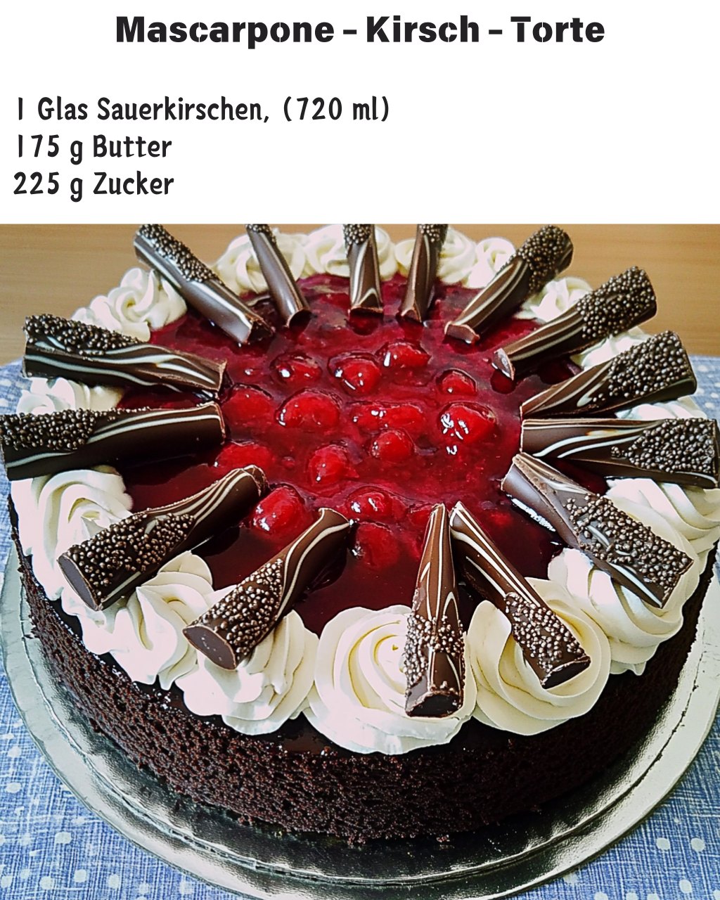 festliche Torte mit PfiffGenieße deine köstliche Mascarpone – Kirsch – Torte! Zutaten:1 Glas Sauerkirschen, (720 ml)175 g Butter225 g Zucker3 Ei(er)200 g Mehl2 TL Backpulver3 EL Nutella (Nussnougat-Creme)500 g Mascarpone250 g Quark (Magerquark)1 Pck. Tortenguss, rot250 ml Sahne1 Dose Waffelröllchen mit Cremefüllung (400g)Zubereitung: Das Rezept wird auf der nächsten Seite fortgesetz