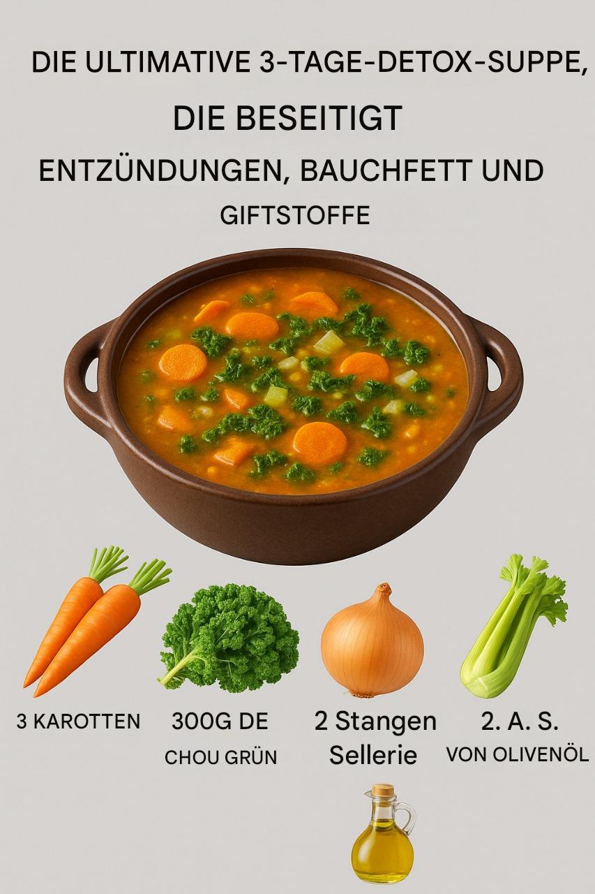🥣 Detox Suppe 3 Tage 📝 Zutaten: 3 Karotten 300 g Grünkohl (oder Spinat) 1 Zwiebel 2 Stangen Sellerie 2 EL Olivenöl 2 Knoblauchzehen 1 Liter Wasser oder Gemüsebrühe Salz, Pfeffer, Kurkuma, Ingwer (nach Geschmack) Zitronensaft (optional, zum Servieren) Weiter mit dem Rezept auf der nächsten Seite