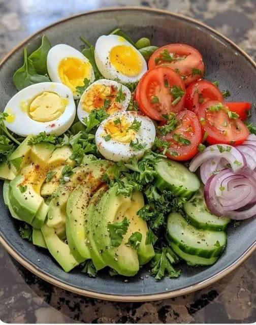 2. gekochte Eier, Avocado, Tomate, Gurke und Zwiebel gepflegt anrichten.