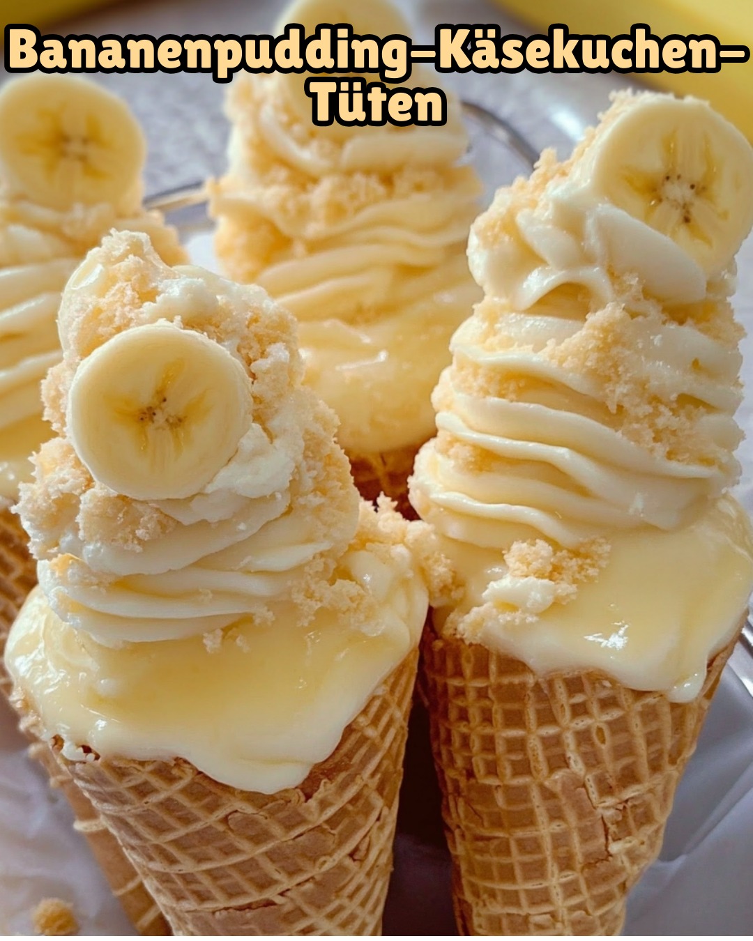 Diese süßen Waffelhörnchen vereinen cremigen Cheesecake, fruchtigen Bananenpudding und knusprige Kekse – ideal für Partys oder als besonderer Snack!