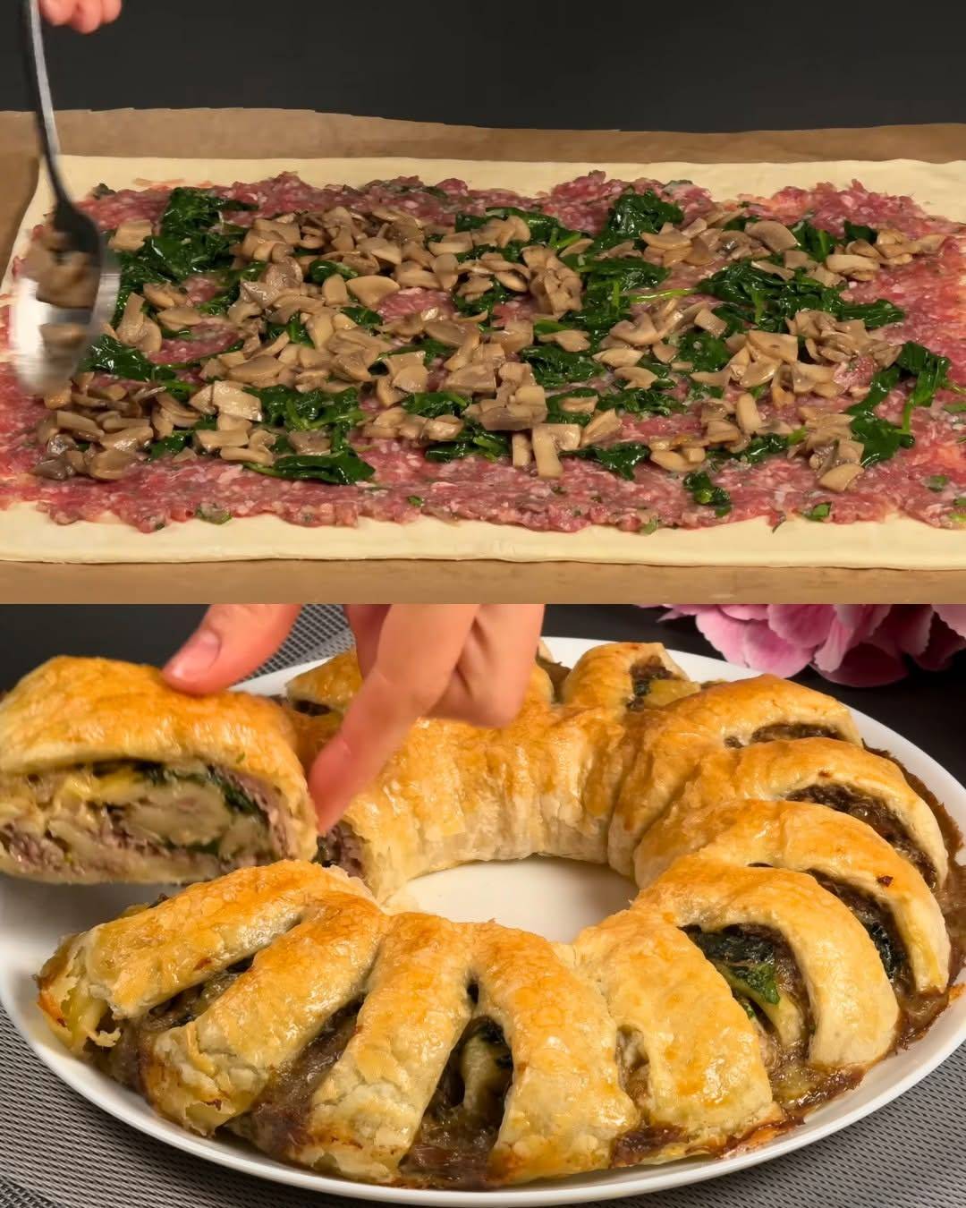 Blätterteig mit Hackfleisch, Spinat und Pilzen ist ein herzhaftes Gebäck, das die Fülle von Hackfleisch mit den erdigen Aromen von Pilzen und der Frische von Spinat vereint. Die cremige Füllung, gepaart mit knusprigem Blätterteig, ergibt ein köstliches Gericht, das sich perfekt zum Mittag-, Abendessen oder als Vorspeise eignet. Dieses Rezept ist voller Geschmack, und die Kombination aus Gewürzen, Gemüse und Käse verleiht ihm eine Textur und einen Geschmack, der garantiert überzeugt.