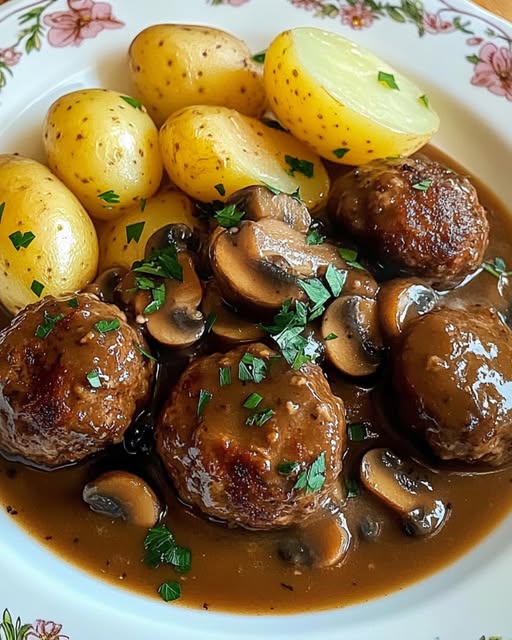 Saftige Hackfleischbällchen mit einer aromatischen Pilzsoße aus Champignons und Waldpilzen, serviert mit Kartoffeln – ein echter Klassiker der deutschen Küche.