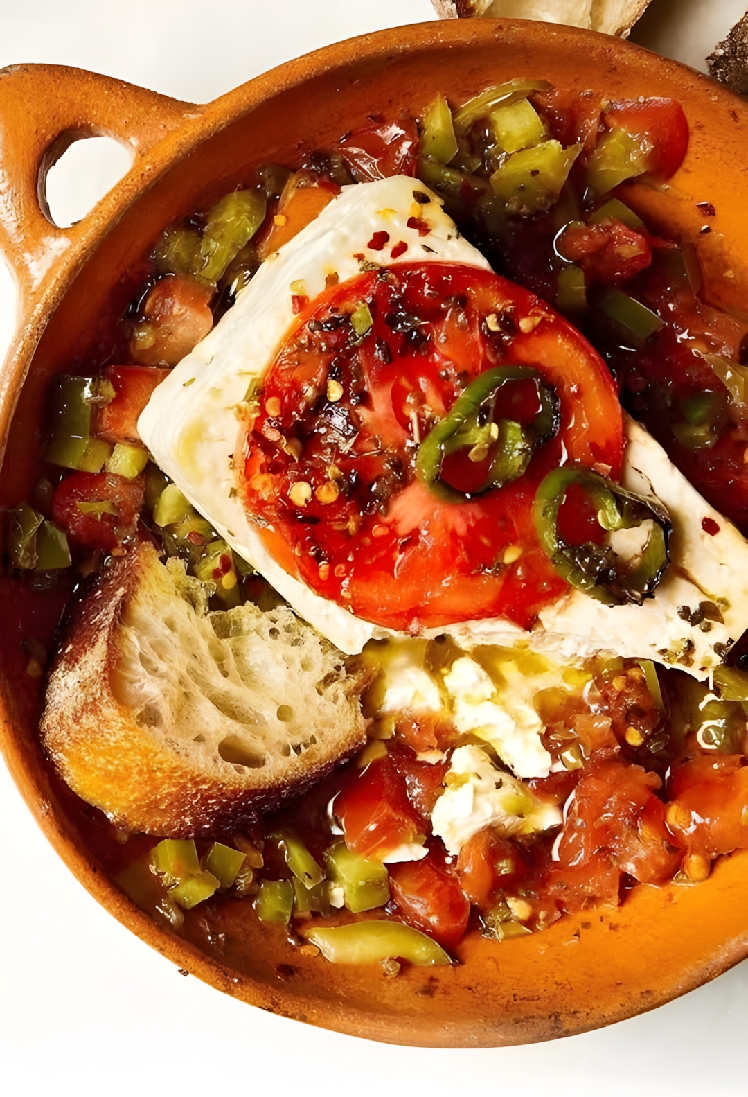 Bouyiourdi ist ein überbackenes Käsegericht aus Feta und verschiedenen Zutaten wie Tomaten, grüner Paprika und Gewürzen.