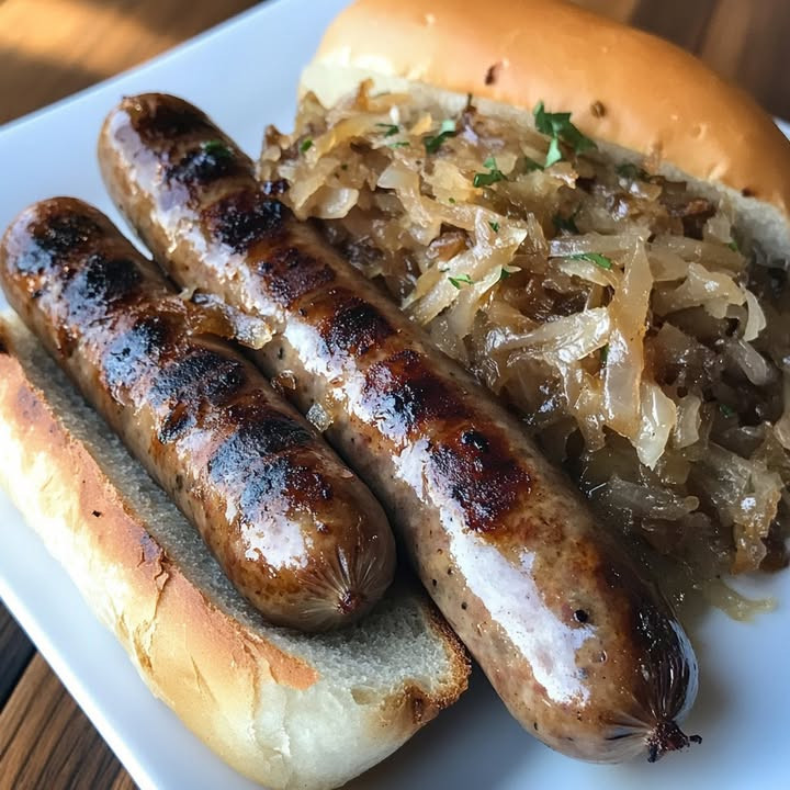 4 Bratwürste (frisch), 2 große Zwiebeln,