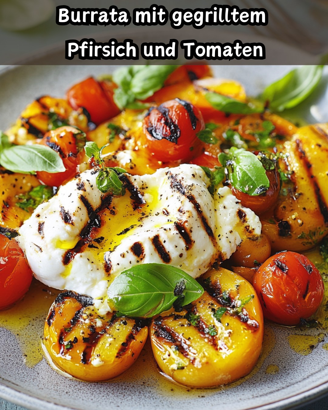 Ein erfrischendes Sommergericht mit cremiger Burrata, saftigen Pfirsichen und süßen Tomaten – perfekt!