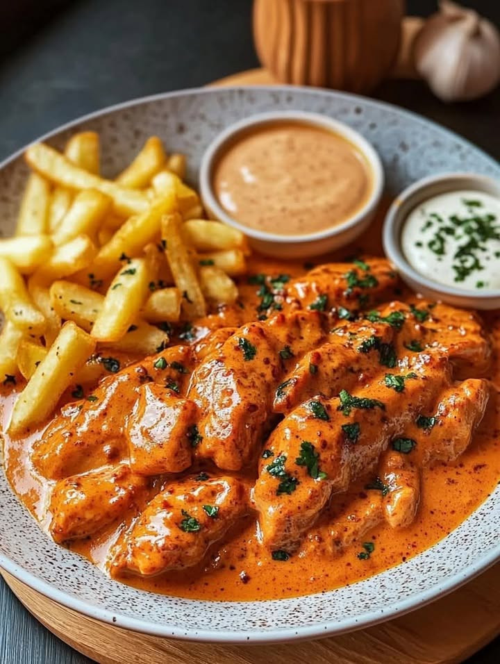 Butter Chicken mit Knoblauchsauce & knusprigen Pommes