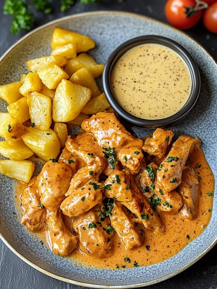 Butter Chicken mit Knoblauchsauce und knusprigen Pommes