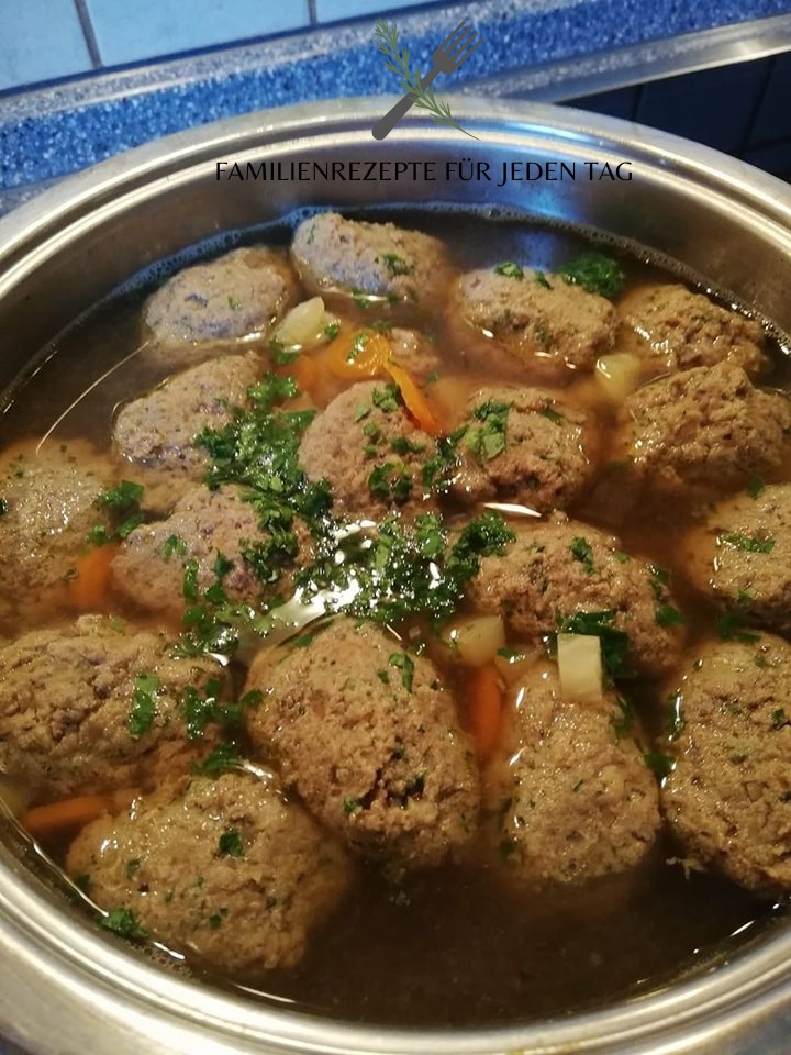 Leberknödelsuppe Omas Rezept400 g Semmel(n), alte, oder vom Bäcker bereits geschnitten250 g Leber(n), durchgedreht, macht evtl. der Metzger500 ml Milch, heiß2 Ei(er)1 Handvoll Petersilie1 Zwiebel(n)1 Handvoll MajoranSalz und Pfeffer2 EL Butter1 Bund Suppengemüse (Karotten, Sellerie, Lauch)