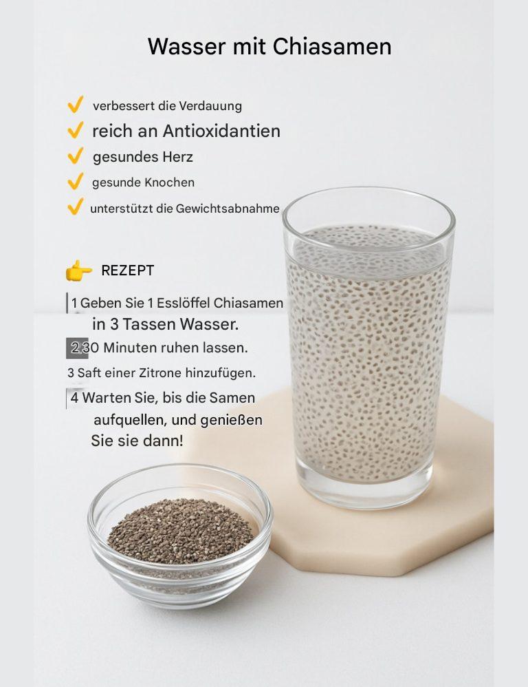 Chiasamenwasser ist nicht nur ein köstliches und erfrischendes Getränk, sondern auch eines der wohltuendsten Gesundheitsrezepte, die Sie zu Hause zubereiten können. Dank seiner reichhaltigen Nährstoffe ist diese einfache Mischung eine ideale Ergänzung Ihrer täglichen Ernährung. Es kann die Verdauung verbessern, Ihr Herz-Kreislauf-System unterstützen, die Knochengesundheit erhalten und beim Abnehmen helfen. Wenn Sie nach einer natürlichen Möglichkeit suchen, Ihre Gesundheit zu optimieren, ist Chiasamenwasser genau das Richtige für Sie.
