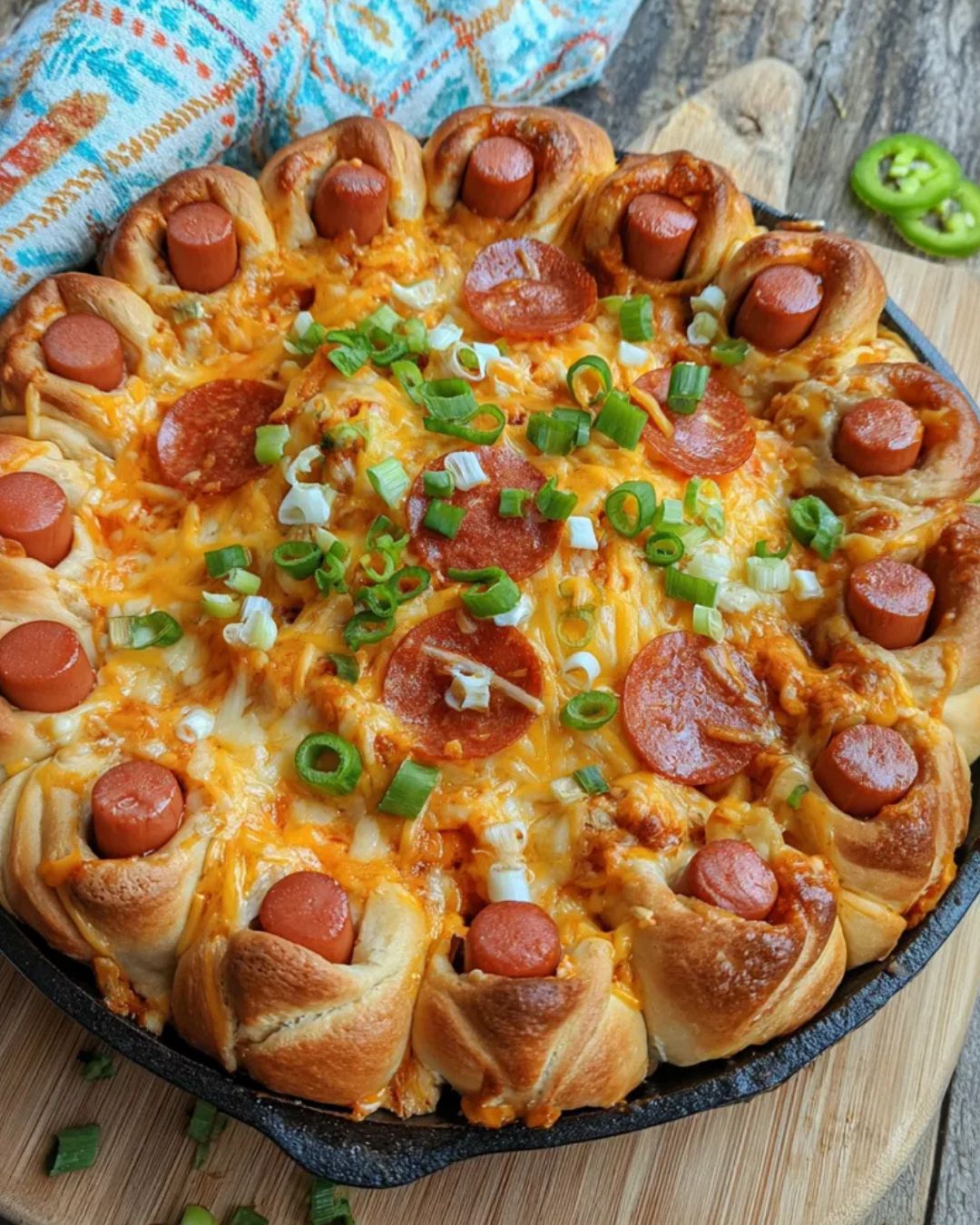 Ein herzhafter Dip verbindet würziges Chili, zarte Hotdog-Stückchen und geschmolzenen Käse, alles eingebettet in goldbraun gebackenen Blätterteig. Die Hotdogs werden ummantelt und am Rand der Form angeordnet, während die köstliche Mischung aus Chili, Frischkäse und Cheddar die Mitte füllt. Mit frischen Frühlingszwiebeln und optionalen Jalapeños garniert, bietet dieses Gericht die perfekte Mischung aus herzhaft und pikant, ideal für ein geselliges Beisammensein oder einen Snack-Abend. Einfach vorzubereiten und direkt aus dem Ofen serviert, begeistert es Jung und Alt.