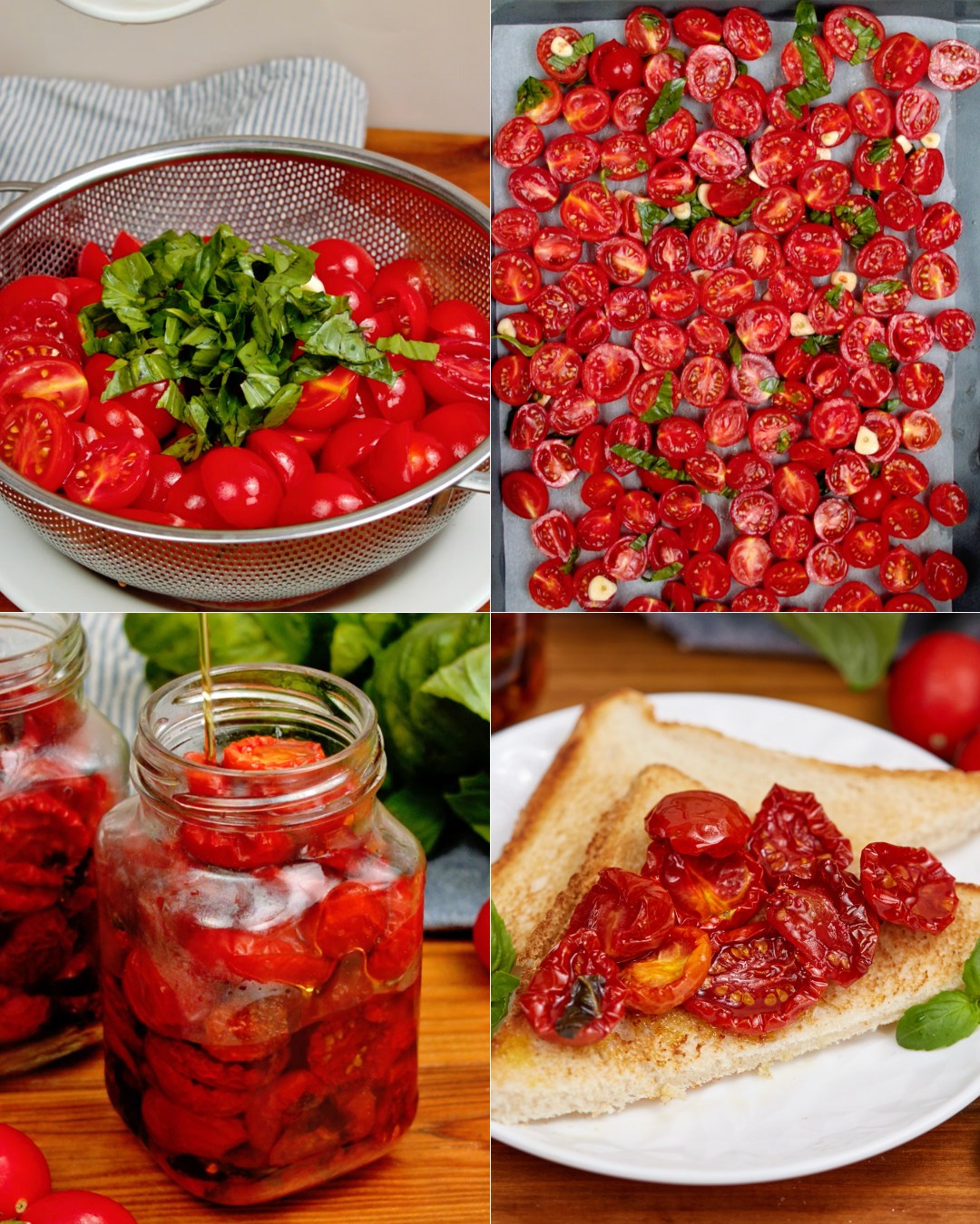 Wenn Sie etwas zubereiten möchten, das als Vorspeise oder Beilage verwendet werden kann und nicht zu viel Zeit in Anspruch nimmt, könnte das Rezept für kandierte Kirschtomaten etwas für Sie sein: Die Tomaten werden getrocknet, gewürzt und in Öl eingelegt. Die Zubereitung ist überhaupt nicht schwierig, Sie müssen lediglich die Trocknungszeiten der Tomaten beachten.