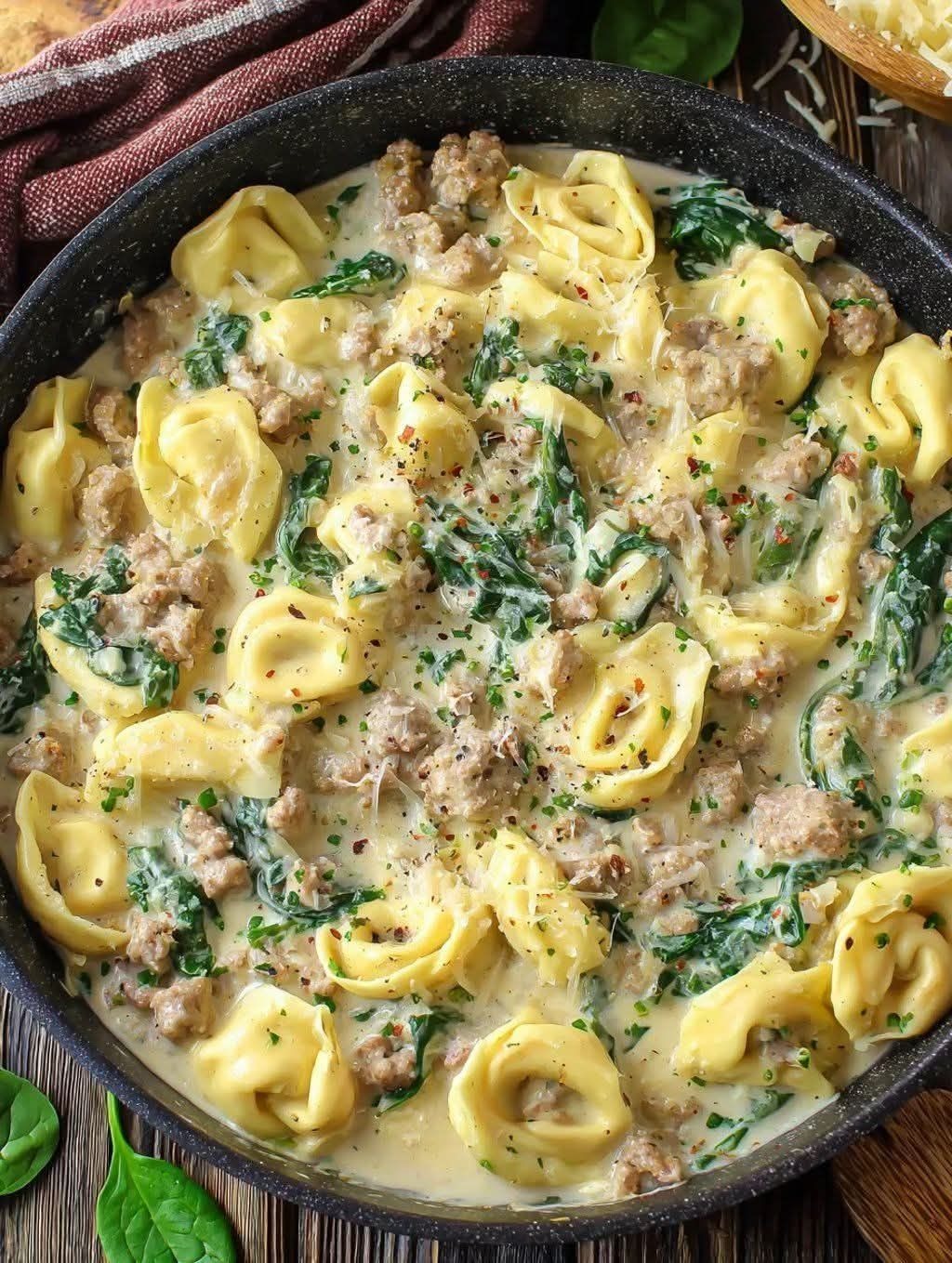 Dieses cremige Tortellini-Sausage-Pfannengericht gehört zu meinen absoluten Lieblingsrezepten unter der Woche Das alles in einer Pfanne Gericht spart nicht nur Geschirr sondern begeistert die ganze Familie mit einer köstlich satten Sauce die jede Pasta liebt