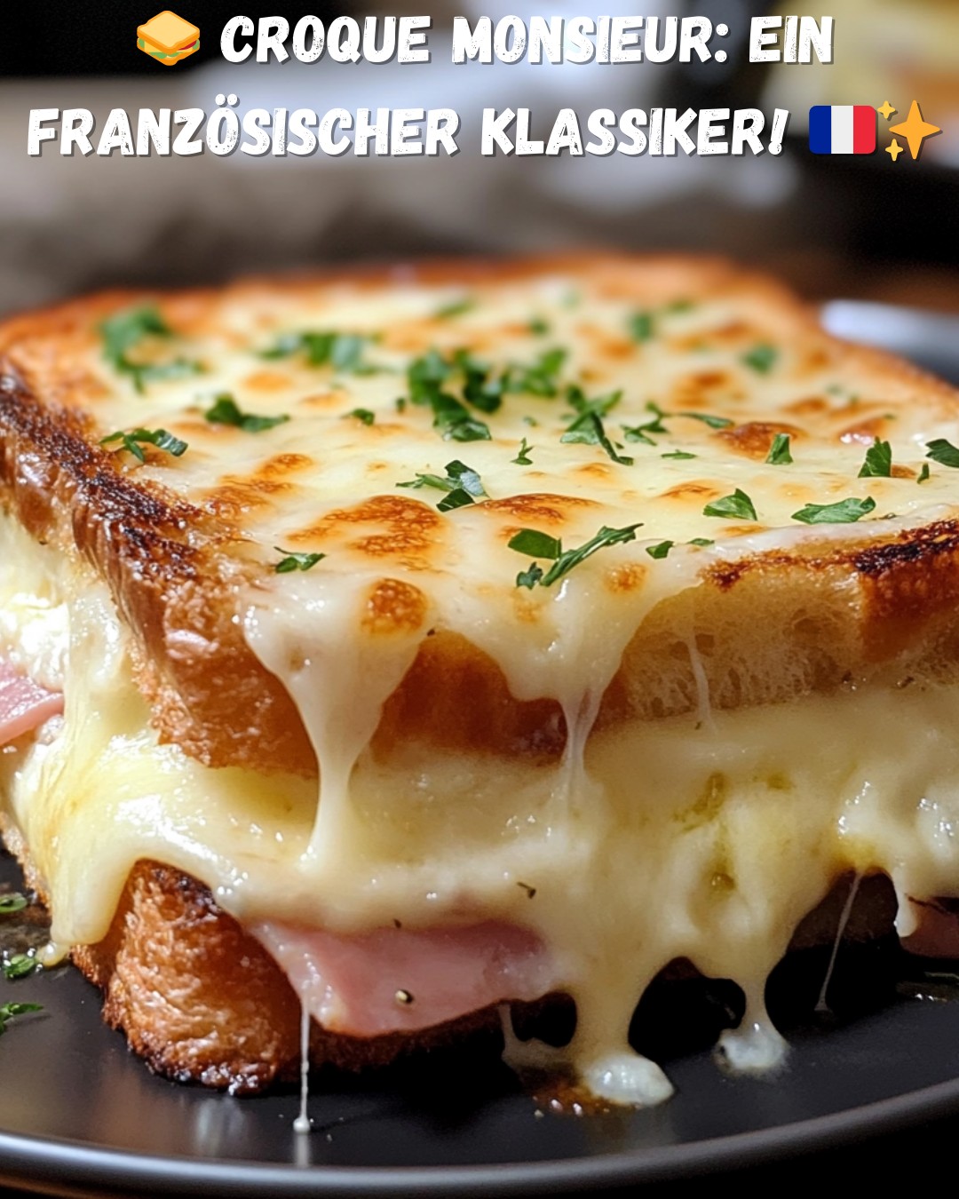 Ein herzhafter französischer Snack aus knusprigem Brot, geschmolzenem Käse und Schinken.