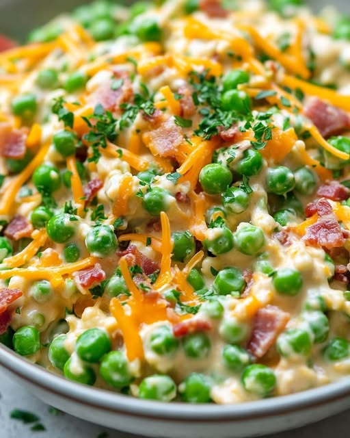 Cremiger Erbsensalat mit Speck und geriebenem Cheddar ist ein köstliches Gericht, das Erinnerungen an Sommerpicknicks und Familienfeiern im Mittleren Westen weckt. Dieser Salat vereint cremige, knackige und herzhafte Aromen perfekt und ist ein Hit bei jedem Potluck oder Barbecue. Frische oder gefrorene Erbsen lassen sich hervorragend genießen, und die Zugabe von knusprigem Speck und würzigem Cheddar macht ihn zu etwas ganz Besonderem. Ob schnelle Beilage oder etwas, das Sie für eine arbeitsreiche Woche vorbereiten können – dieser Salat ist eine vielseitige und köstliche Option.