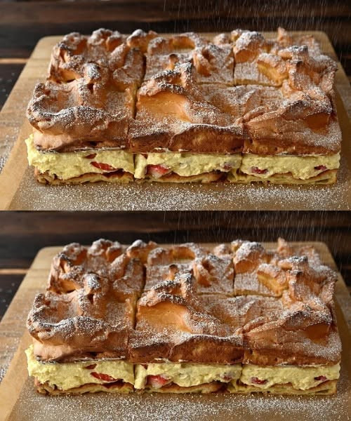 Mit den restlichen Erdbeeren garnieren und mit Puderzucker bestreuen.