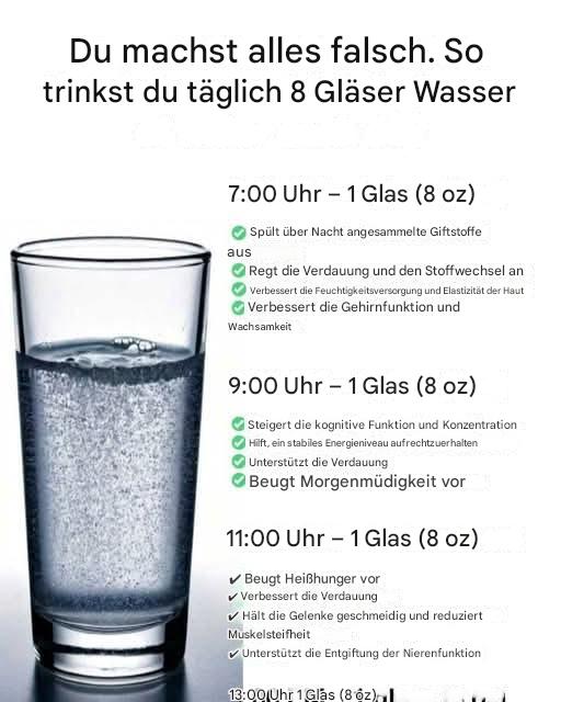 Die „8 Gläser pro Tag“-Regel ist eine einfache Richtlinie, die vorschlägt, täglich etwa acht Gläser Wasser (237 ml) zu trinken, insgesamt also etwa zwei Liter. Diese Empfehlung basiert auf dem durchschnittlichen Bedarf eines gesunden Erwachsenen, kann aber je nach Faktoren wie Alter, Geschlecht, Aktivitätsniveau und Klima variieren. Obwohl diese Regel als allgemeiner Richtwert dient, ist es wichtig, auf die Signale des Körpers zu hören und die Wasseraufnahme entsprechend anzupassen.