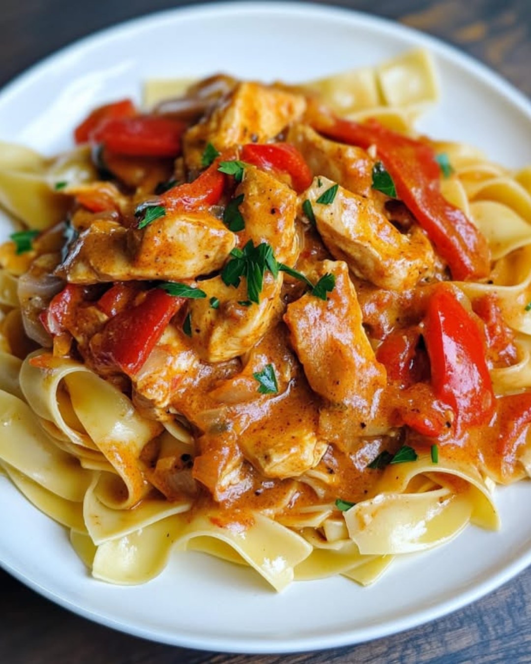 Dieses Paprika-Hähnchen in cremiger Sauce mit Bandnudeln ist ein echter Familienfavorit. Die Kombination aus zartem Hähnchenfleisch, frischer Paprika und würziger Paprikasahnesauce passt perfekt zu breiten Nudeln und bringt Farbe und Geschmack auf den Teller. In weniger als 30 Minuten zauberst du ein Gericht, das garantiert Groß und Klein begeistert – ideal für den Feierabend, das Wochenende oder das spontane Familienessen. Die aromatische Sahnesauce mit zweierlei Paprikapulver bringt Würze und Tiefe ins Gericht, während die frische Petersilie für einen Hauch Frische sorgt. Dank der wenigen, aber geschmackvollen Zutaten ist dieses Rezept nicht nur schnell gekocht, sondern auch absolut gelingsicher – perfekt für die Alltagsküche!