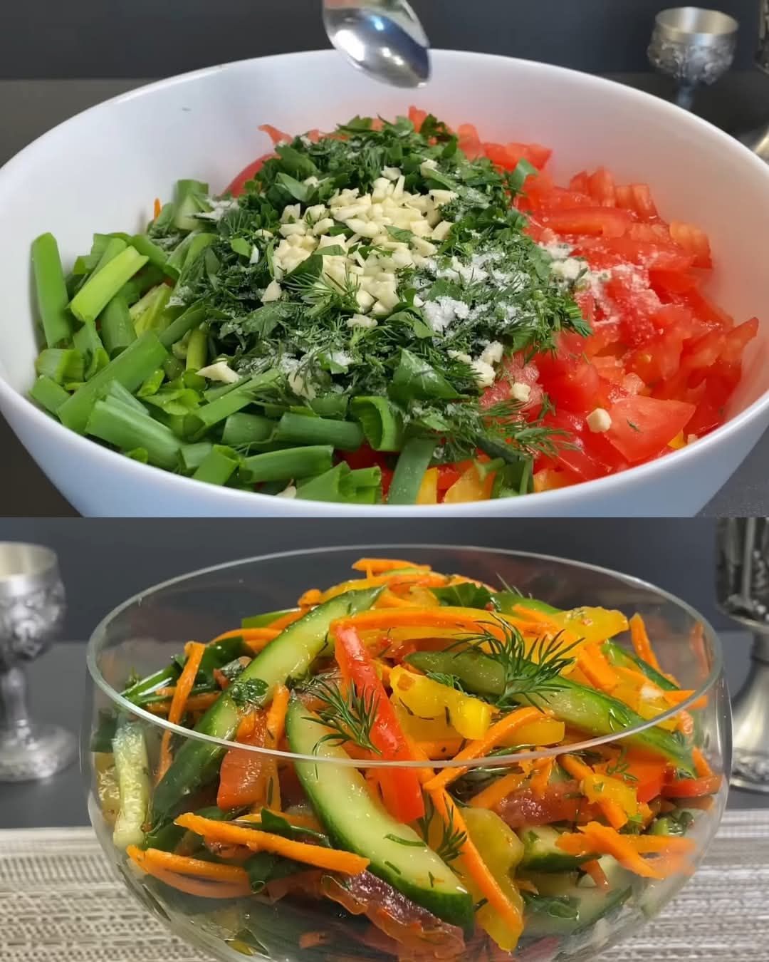 Dieser erfrischende Gurkensalat ist ein leichtes, knackiges und pikantes Gericht aus frischen Gurken, Karotten, Paprika und Tomaten , verfeinert mit einem würzigen Dressing aus Knoblauch, Paprika, Sojasauce und Apfelessig . Vollgepackt mit Vitaminen, Ballaststoffen und Antioxidantien ist dieser Salat nicht nur gesund und lecker, sondern auch einfach zuzubereiten und perfekt für jede Mahlzeit . Er eignet sich hervorragend als Beilage zu gegrilltem Fleisch, Meeresfrüchten oder einer leichten vegetarischen Mahlzeit .