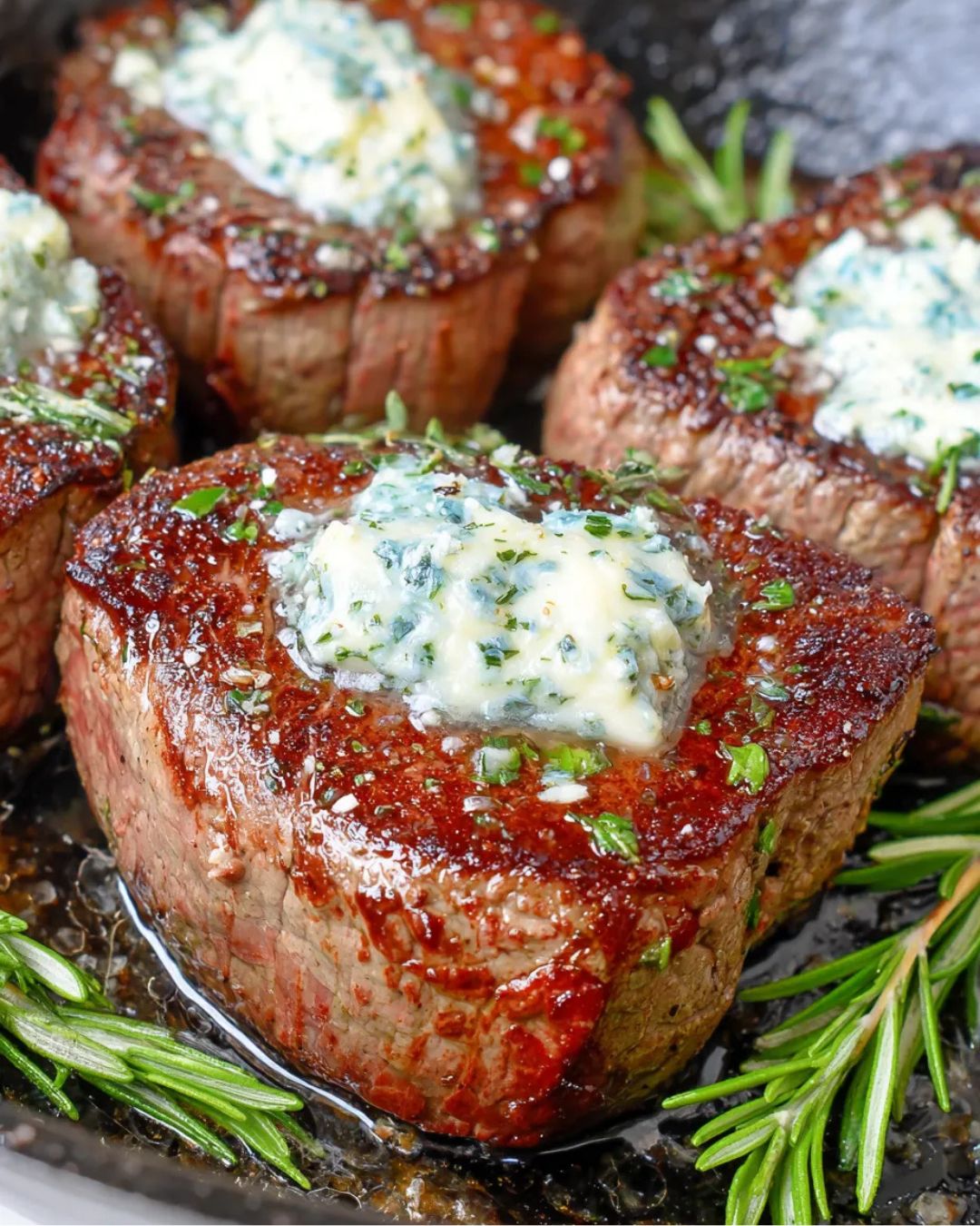 Dieses Filet Mignon mit Knoblauch-Kräuterbutter überzeugt durch zartes Fleisch und intensive Aromen. Die Steaks werden erst angebraten, dann im Ofen gegart, wodurch eine perfekte Konsistenz erreicht wird. Die Butter, verfeinert mit frischem Rosmarin, Thymian und gehacktem Knoblauch, zerschmilzt auf dem heißen Fleisch und umschmeichelt den Gaumen. Das Gericht eignet sich für besondere Anlässe oder als Highlight eines jeden Essens. Servieren Sie es mit frischer Petersilie und genießen Sie das vollmundige Geschmackserlebnis.