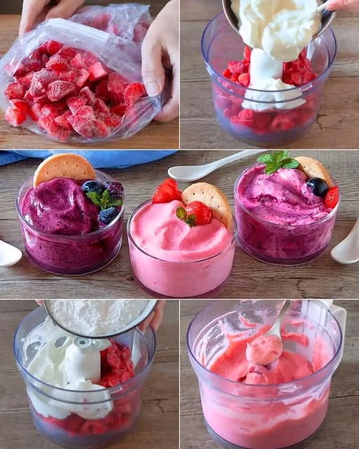 Wir haben zwei verschiedene Geschmacksrichtungen vorbereitet: eine mit Blaubeeren und Brombeeren, die andere mit Erdbeeren. Natürlich könnt ihr je nach Verfügbarkeit auch eure Favoriten probieren: Mango und Banane, Pfirsich und Aprikose, Ananas und Kirschen… Für beste Ergebnisse solltet ihr größere Früchte vor dem Einfrieren würfeln, um eine glatte, samtige Konsistenz zu erhalten.