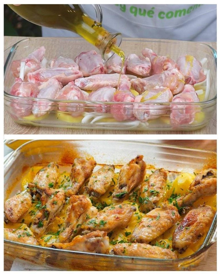 Hier ist ein köstliches Rezept für die Zubereitung gebackener Hähnchenflügel mit Kartoffeln , einem leckeren und sättigenden Gericht: