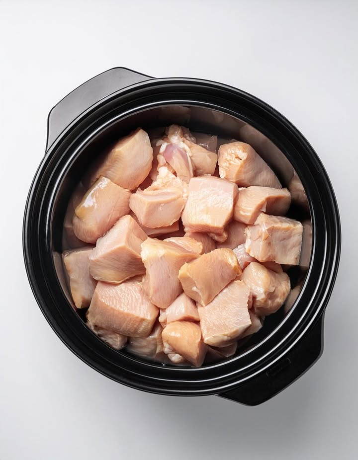 Geben Sie rohes, gewürfeltes Hähnchenfleisch mit diesen 4 Zutaten in einen Slow Cooker. Sie werden den ganzen Winter lang Appetit darauf haben.