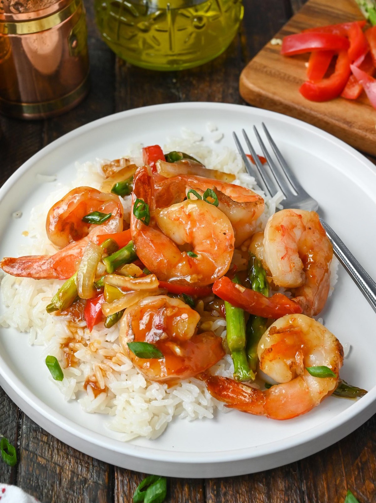 Dieses Pfannengericht mit süßen Chiligarnelen enthält sautierte Garnelen, Zwiebeln, rote Paprika und Spargel, alles garniert mit einer süß-sauren Sauce.