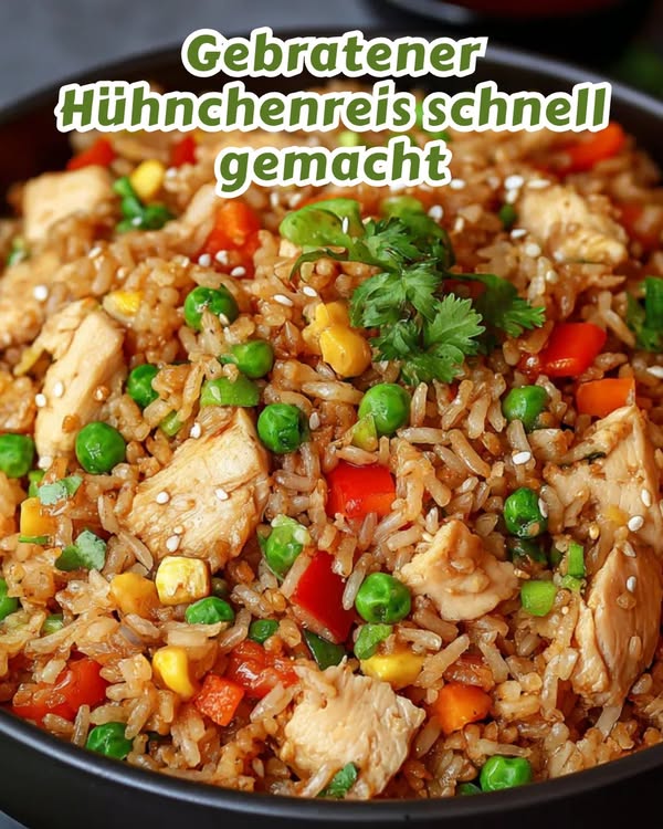 Gebratener Hühnchenreis vereint saftige Hähnchenwürfel mit lockerem Reis, knackigem Gemüse und aromatischen Gewürzen zu einem schmackhaften Gericht. Zunächst wird der Reis vorbereitet, während das Hähnchen scharf angebraten und mit Paprika, Kurkuma und Kräutern gewürzt wird. Danach sorgt eine Mischung aus Zwiebel, Knoblauch, Ingwer und verschiedenen Paprika für frische und tiefe Aromen. Alles wird zusammen mit Erbsen, Sojasauce und Sesamöl vereint und bei mittlerer Hitze durchgeschwenkt, sodass die Zutaten die Gewürze aufnehmen. Frühlingszwiebeln und optional Koriander sorgen für einen frischen Akzent beim Servieren.