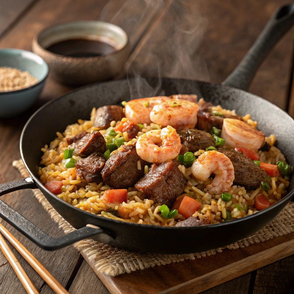 Dieser gebratene Reis mit Steak und Garnelen ist ein köstliches Restaurantgericht mit saftigem Steak, zarten Garnelen, lockerem gebratenem Reis und kräftigen asiatischen Aromen. Gekocht im glühend heißen Wok, vereint dieses Gericht herzhafte Steakstücke mit Knoblauchbutter, pralle Garnelen und perfekt gewürzten gebratenen Reis mit Sojasauce, Sesamöl und frischem Gemüse. Die perfekte Fusion aus Surf and Turf – ein unwiderstehliches Ein-Pfannen-Gericht für arbeitsreiche Wochentage oder besondere Anlässe!