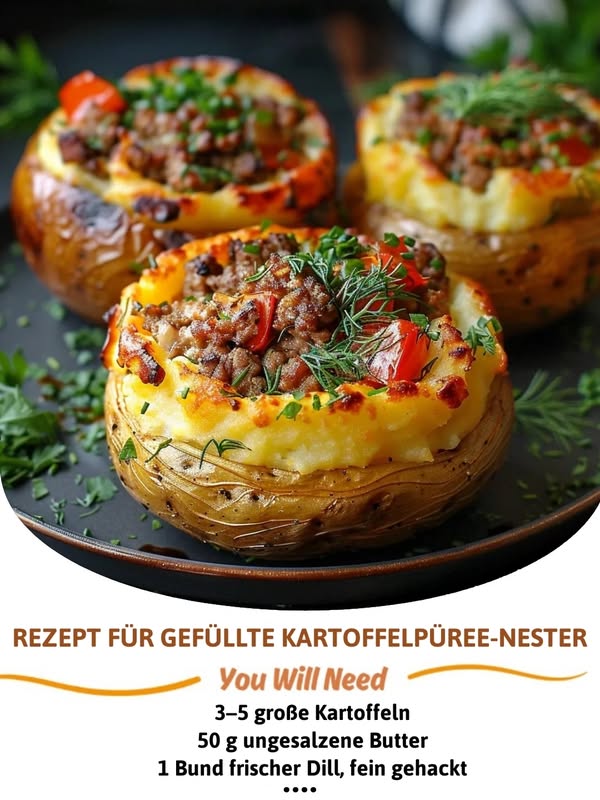 Gefüllte Kartoffelpüree-Nester vereinen cremigen Kartoffelpüree mit einer würzigen Hackfleischfüllung und überbackenem Mozzarella. Die Kartoffeln werden püriert und mit Gewürzen verfeinert, geformt und mit einer leckeren Füllung aus Hackfleisch, Zwiebeln, Paprika und Tomaten belegt. Im Ofen gebacken, entstehen goldene Nester, außen leicht knusprig und innen herzhaft saftig. Ein Genuss für die ganze Familie!