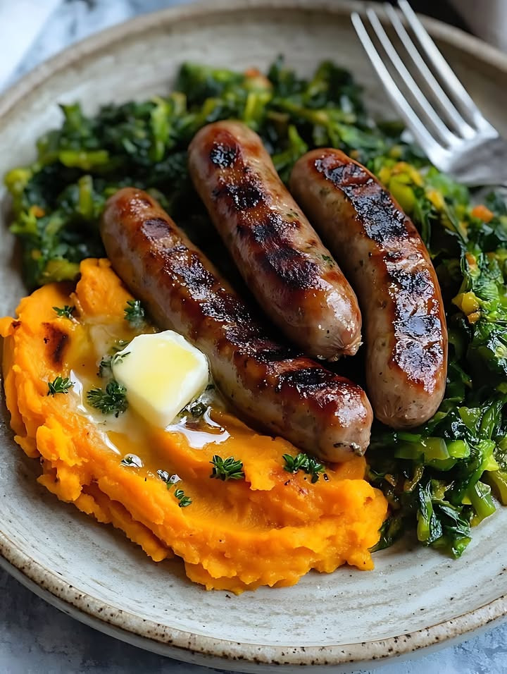 Gegrillte Würste mit Süßkartoffelbrei und Gemüse