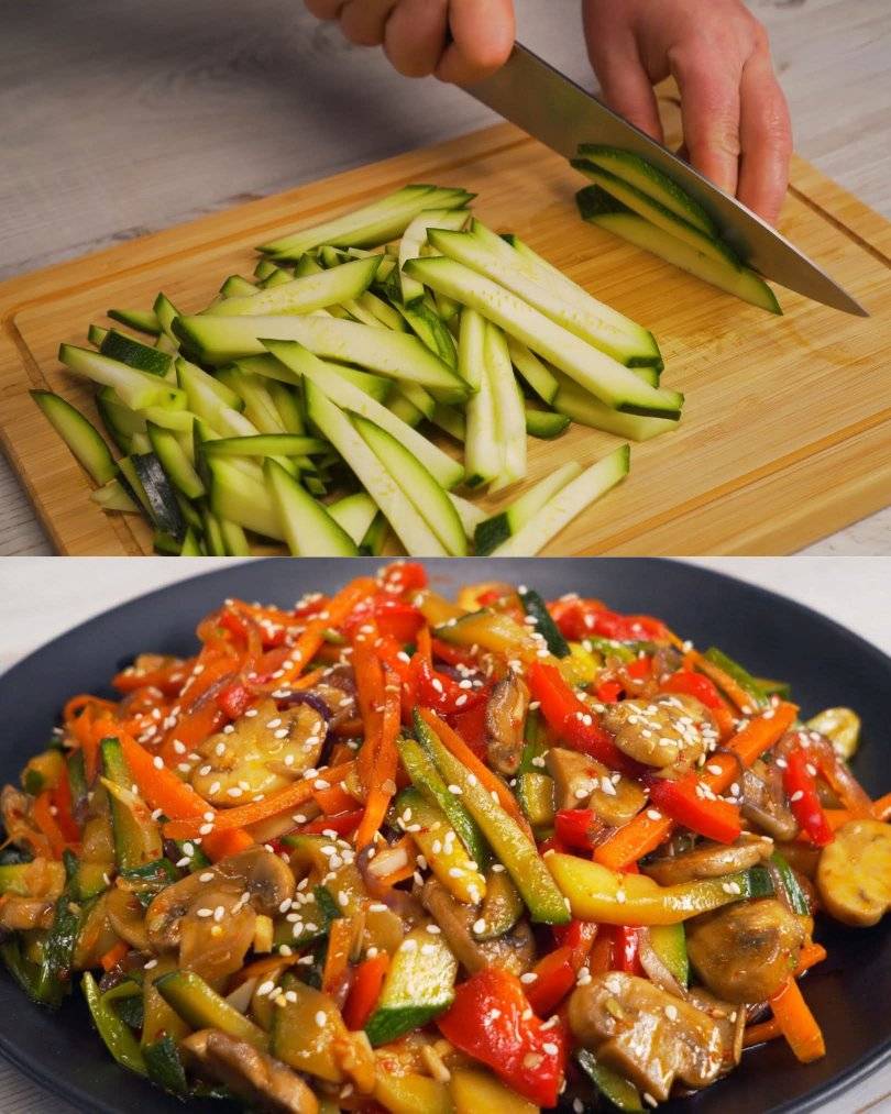 Dieses Gemüsepfannengericht mit Austern-Sojasauce ist ein lebendiges und aromatisches Gericht, das schnell zubereitet ist und sich perfekt für jeden Anlass eignet. Mit einer bunten Mischung aus Zucchini, Paprika, Karotten, roten Zwiebeln und Champignons ist es herzhaft, leicht würzig und wird durch die intensiven Umami-Aromen von Austern-Sojasauce perfekt ergänzt. Durch das Pfannenrühren bleibt das Gemüse knackig und wird gleichzeitig mit der köstlichen Sauce verfeinert. Ob als Beilage oder mit Reis oder Nudeln als Hauptgericht – dieses Pfannengericht ist ein Genuss!
