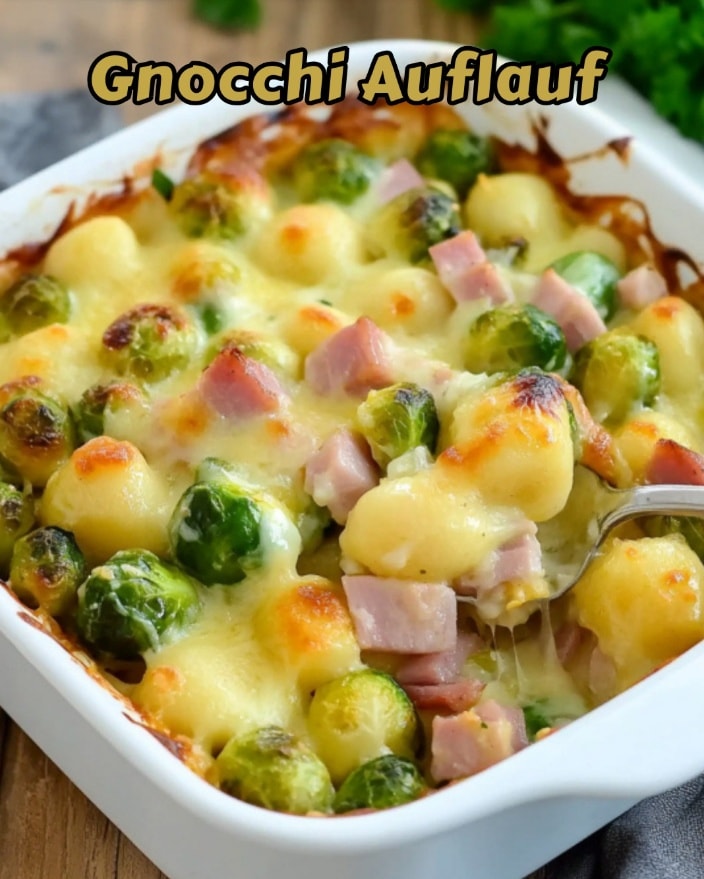 Herzhafter Gnocchi-Auflauf mit Rosenkohl, Schinken und cremiger Sauce – das perfekte Wohlfühlgericht!