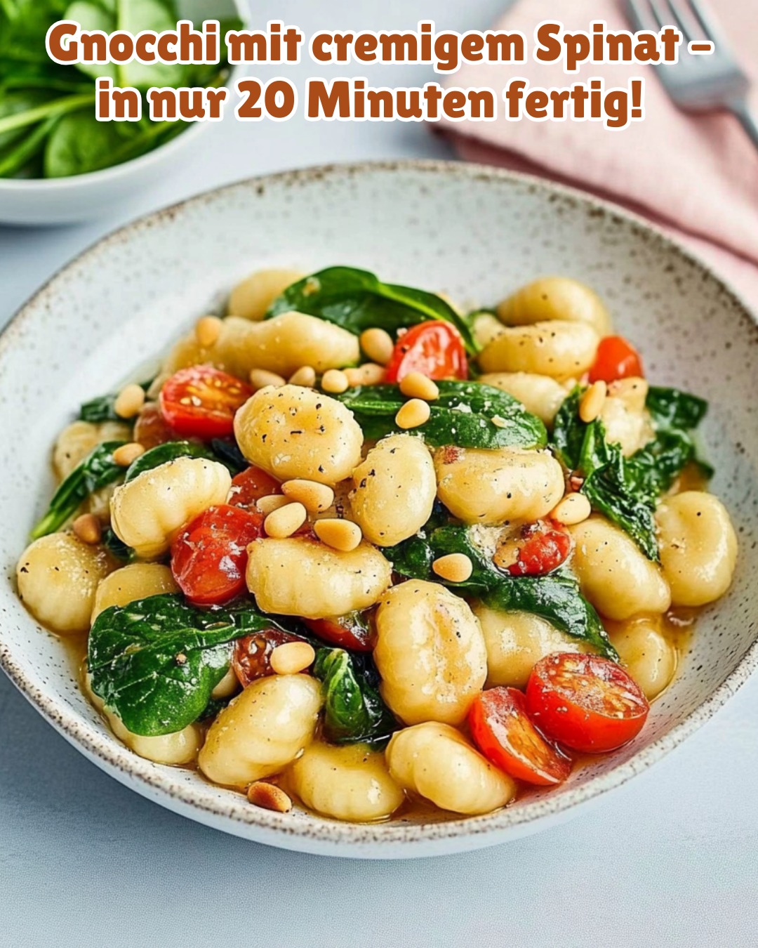 Schnelle Gnocchi in cremiger Spinatsoße mit Kirschtomaten und gerösteten Pinienkernen – einfach lecker!