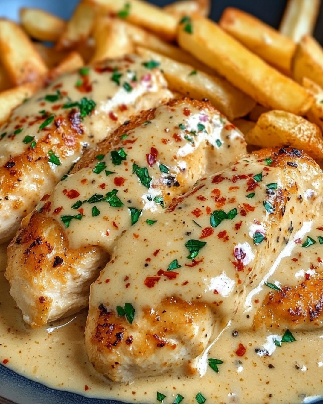 Hähnchenfilet in würziger, cremiger Knoblauch-Parmesan-Sauce mit Pommes Frites
