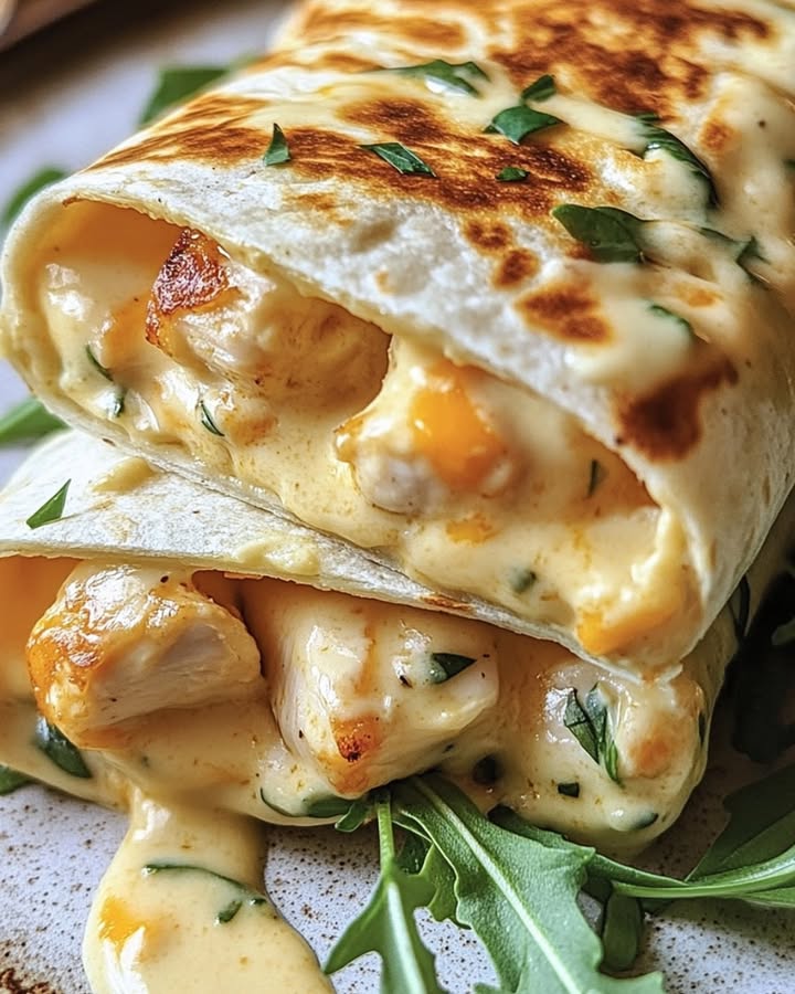 Knusprige Wraps mit zartem Hähnchen und Cheddar-Knoblauch-Sauce** teilen. Diese Wraps sind einfach unwiderstehlich!