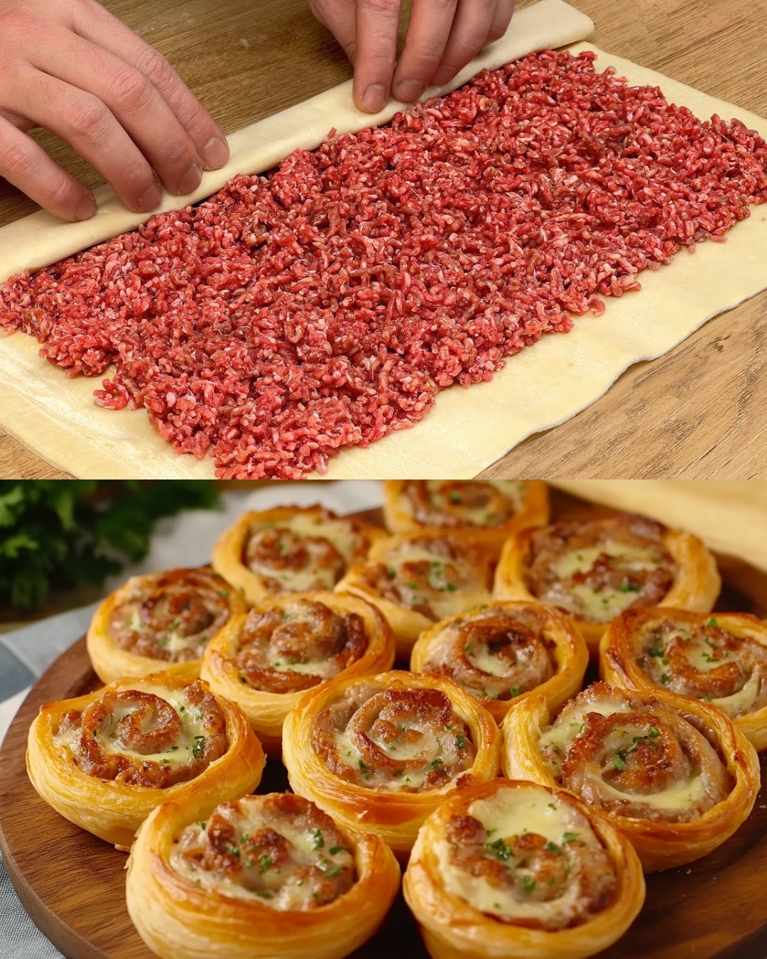 Ein knuspriger, goldbrauner Blätterteig umhüllt eine herzhafte Füllung aus würzigem Hackfleisch, Käse und Eiern – perfekt für ein Mittagessen, Picknick oder als herzhafte Partyrolle.