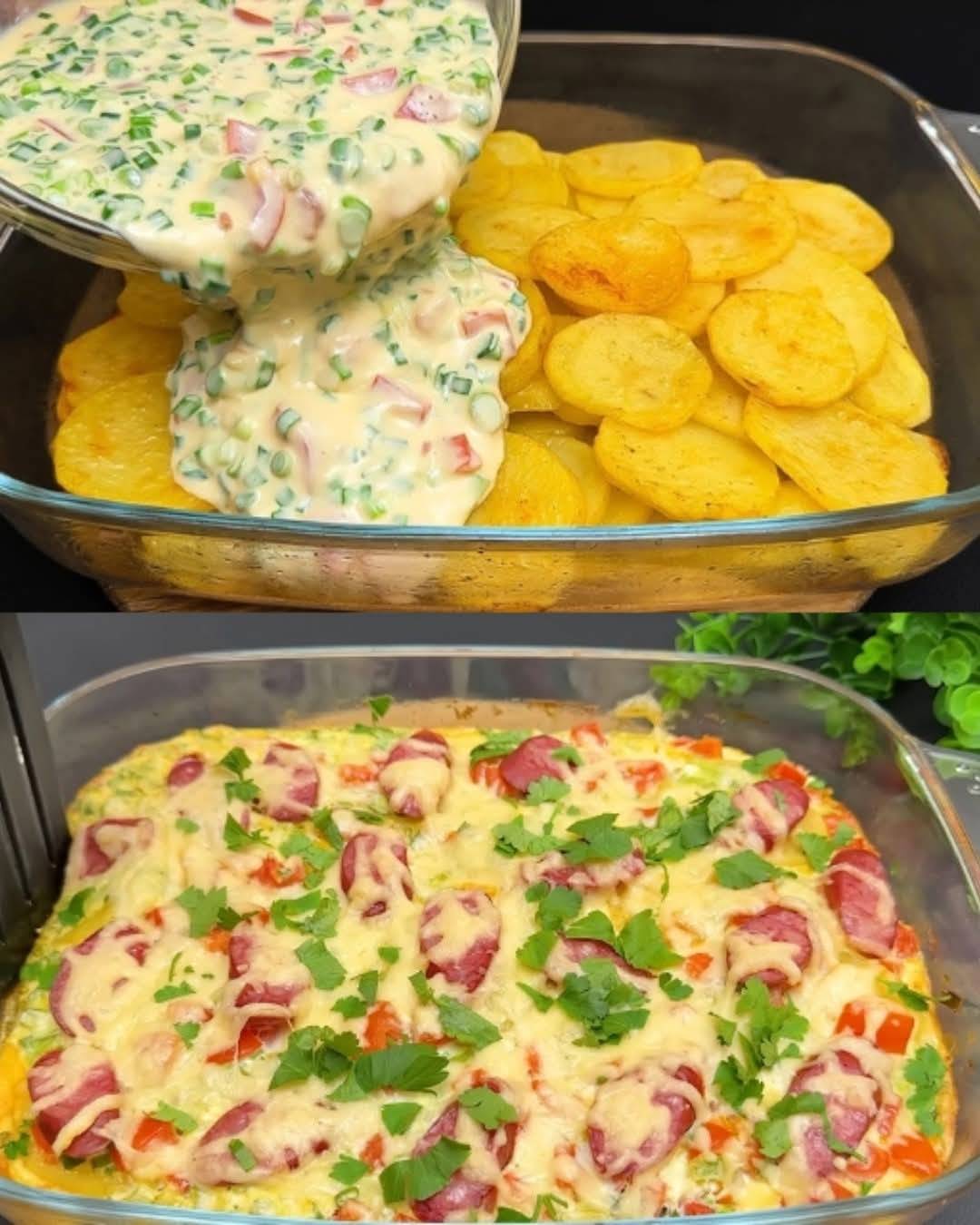 Dieser herzhafte Ofenkartoffelauflauf ist eine Symphonie wohltuender Aromen und Texturen. Zarte, gewürzte Kartoffelscheiben bilden die Basis, garniert mit einer cremigen, herzhaften Ei-Sauerrahm-Mischung, frischen Kirschtomaten, würziger Wurst und geschmolzenem Käse. Es ist ein vielseitiges Gericht, perfekt für ein entspanntes Familienessen, einen Brunch oder ein gemütliches Abendessen. Die Kombination aus einfachen Zutaten und der einfachen Zubereitung macht es zu einem Lieblingsrezept für jeden Anlass.