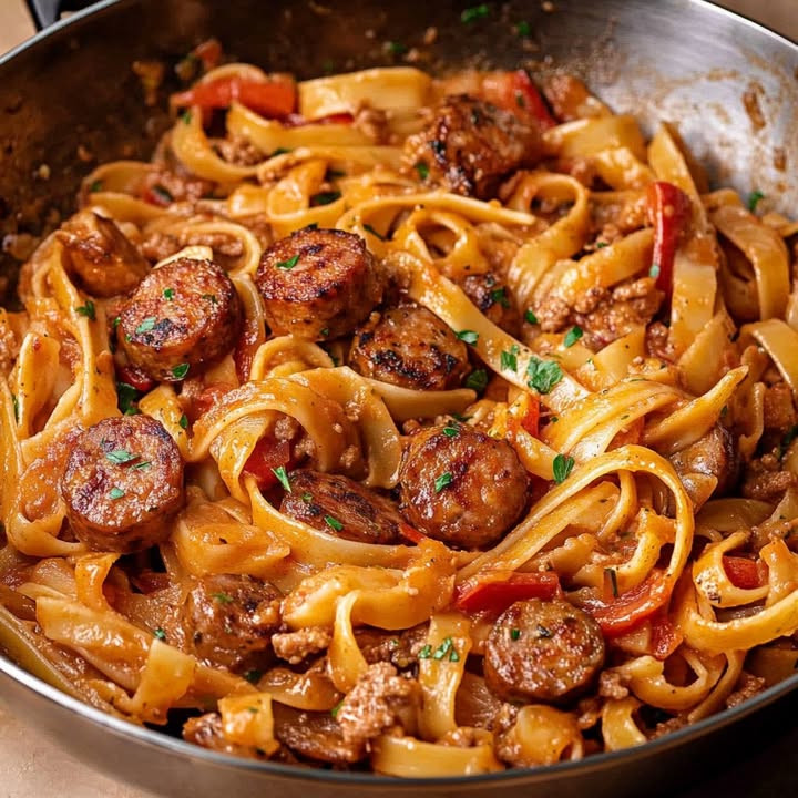 Herzhaftes Wurst-Pfannengericht mit Bandnudeln